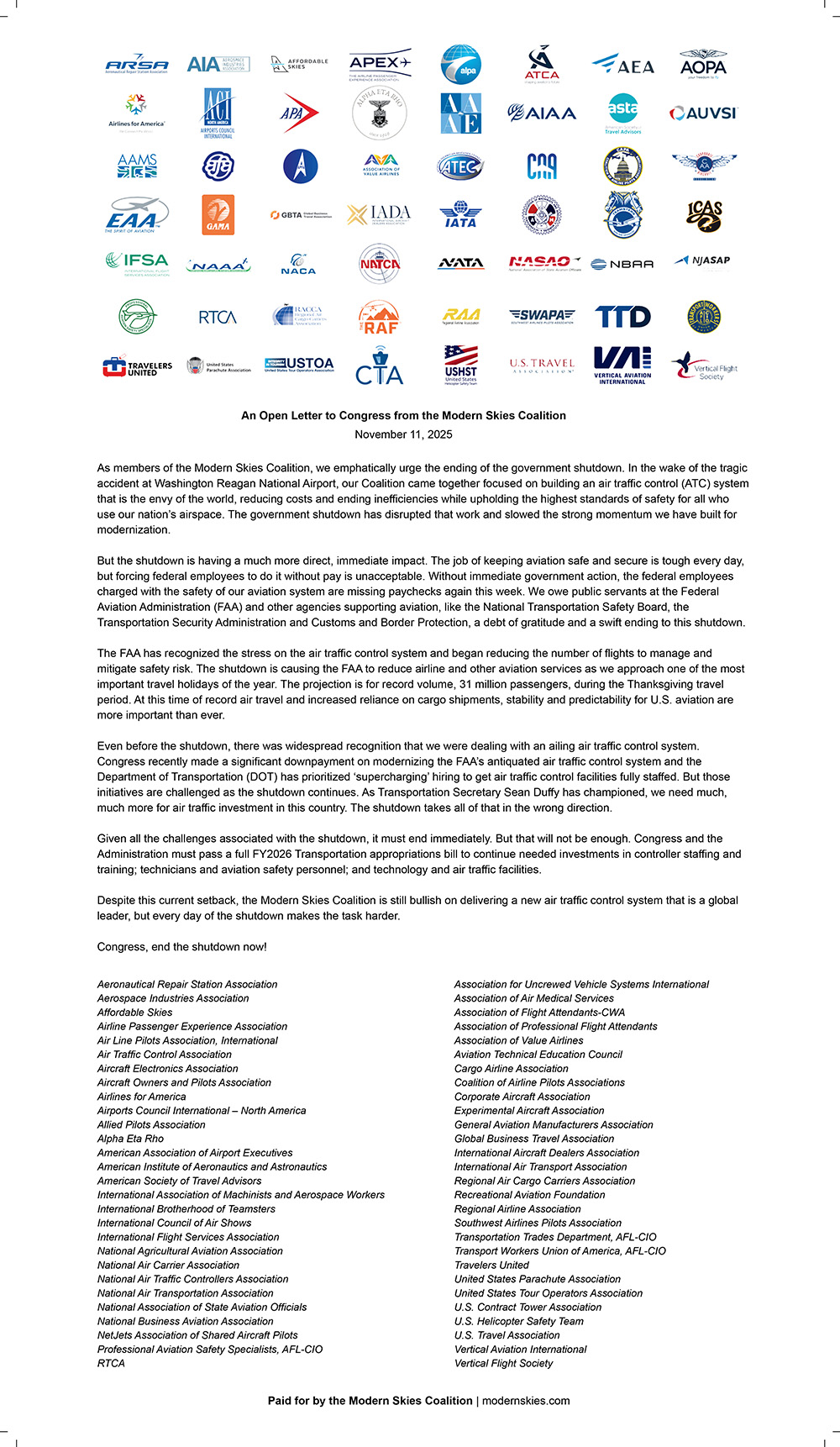 WASHINGTON, November 11, 2025 – The Modern Skies Coalition — representing more than 50 aviation and aerospace organizations — today placed a full-page advertisement in The Washington Post, calling on Congress to immediately end the government shutdown and restore stability to the nation’s aviation system.